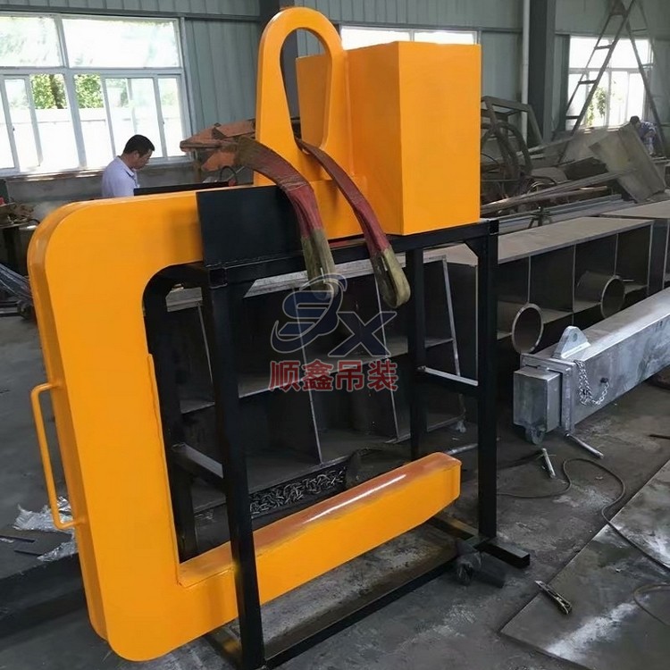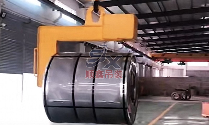 C型吊具適用于鋼卷的水平吊運,由吊具體和配重鐵組成。主體部分由合金鋼和鋼管拼接而成,截面為箱型結(jié)構,配重鐵起調(diào)節(jié)吊具平衡的作用,使吊具和被吊物的重心在一條線內(nèi)。載荷范圍:3.2-32噸。